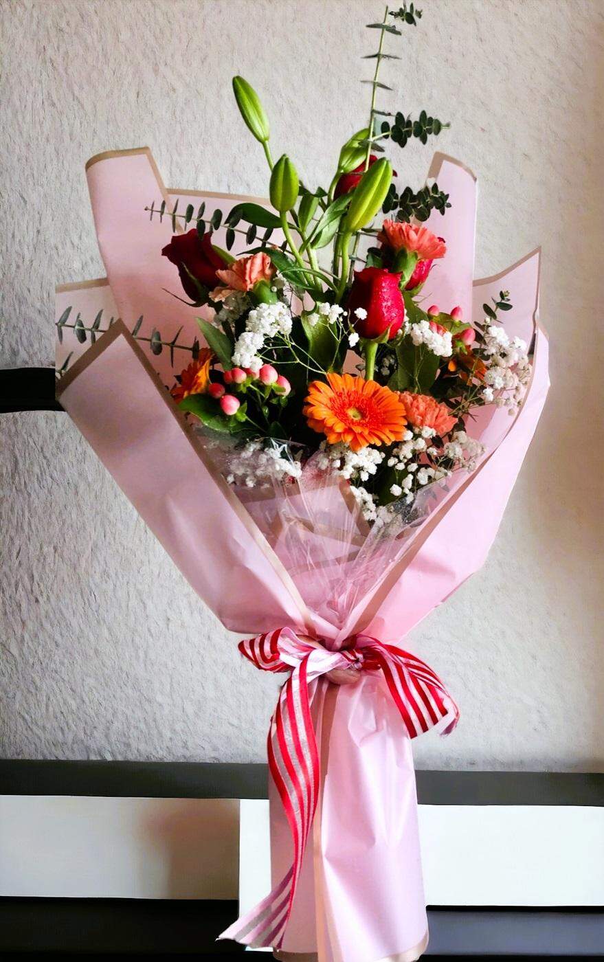 - Flowers & Greens: This bouquet features classic red roses, symbolizing deep love and passion, while peach carnations bring warmth and admiration. Orange gerbera daisies add a touch of joy and cheer, and Asiatic lilies represent devotion and purity. Delicate sprigs of baby’s breath create an airy, dreamy effect, complemented by hypericum berries, adding a playful pop of texture. The entire arrangement is enriched with fancy greenery, offering a lush and natural backdrop.