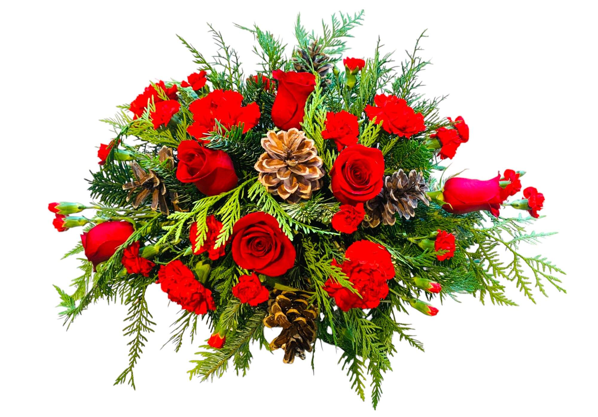 - Flowers & Greens: red rose, mini carnation, carnation and Christmas decorations.