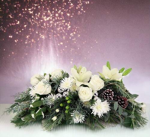 Included: Christmas centerpiece, white rose, white Asiatic lily, white chrysanthemum daisy, greenery and Christmas decorations.