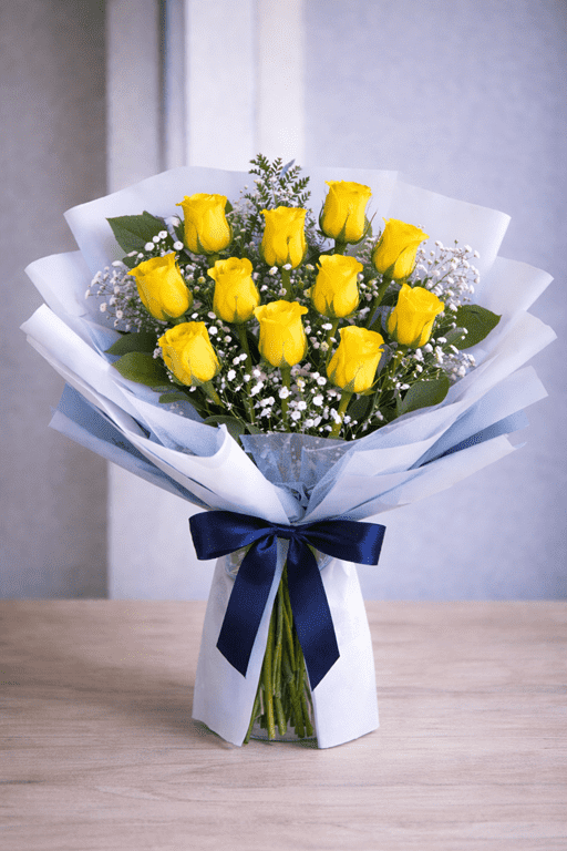 - This bouquet shows 11 stems premium rose and baby’s breath. The striking blend of these flowers and greens makes this bouquet a mesmerizing display of love and commitment.