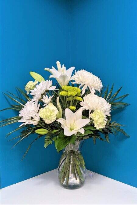 Send someone this soulful floral gift and there’ll be no mistaking that you’re giving them your thoughts! Includes : Clear Vase, Greens, White Asiatic Lily, White Commercial, White Daisy, Green Button Daisy and Green Carnation.
