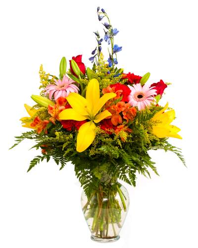 They fill the world with love, so show them some in return! Shower someone special with love and appreciation by sending them premium flowers arrangement . Includes : Clear Vase, Greens, Rose, Gerbera, Blue Delphinium, Yellow Asiatic Lily, Alstroemeria, Carnation and Solidago .