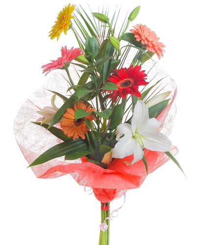 A statement piece that will surely delight! Show someone you care, brighten up your home or simply partake in some self care by gifting yourself this timeless combination. Includes : Greens, Gerbera and White Oriental Lily.