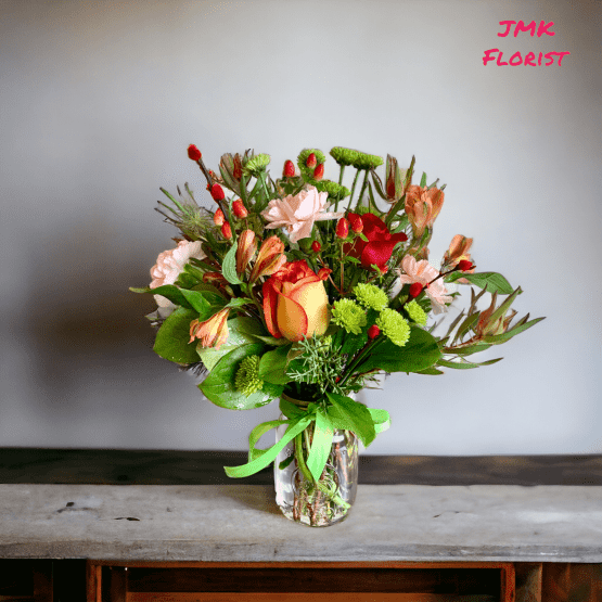 - Features: The arrangement is centered around a warm orange rose, a red rose symbolizing enthusiasm and passion, surrounded by delicate orange alstroemerias, which add a touch of grace and friendship. Pink carnations contribute to the classic charm, while green button chrysanthemum daisies and Hypericum berries provide fresh contrast and texture. Leatherleaf ferns add a lush, green backdrop, ensuring the flowers stand out beautifully.