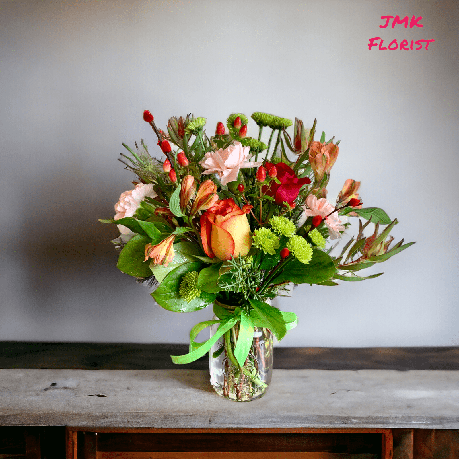 #rose #alstroemeria #carnation #chrysanthemum #hypericum #green #pink #orange