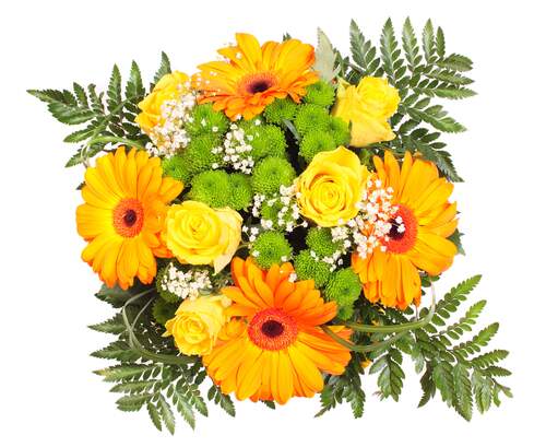 Make an unforgettable declaration of love with this striking bouquet! It is sure to make them fall in love with you all over again! Includes : Greens, Yellow Rose, Orange Gerbera, Green Button Daisy and Baby Breath .