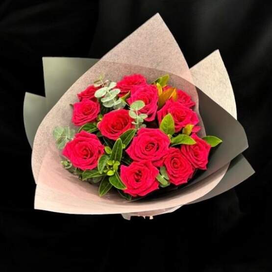 - Flowers & Greens: 1 dozen red rose in handtied bouquet.