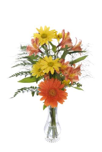 There’s nothing bashful about these blushing blooms! Treat your sweetest someone to a dreamy symphony of bright blooms! Includes : Clear Vase, Greens, Yellow Daisy, Orange Alstroemeria and Orange Gerbera.