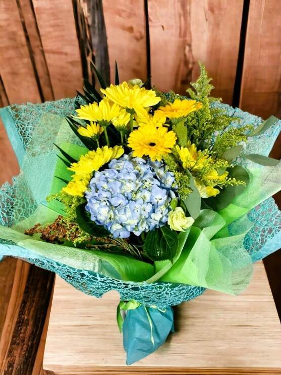 - Flowers & Greens: This floral display features bright yellow Gerbera daisies, deep blue hydrangeas, and yellow spray chrysanthemums. Solidago and green ferns add texture and create a rich natural background to complement the flowers.