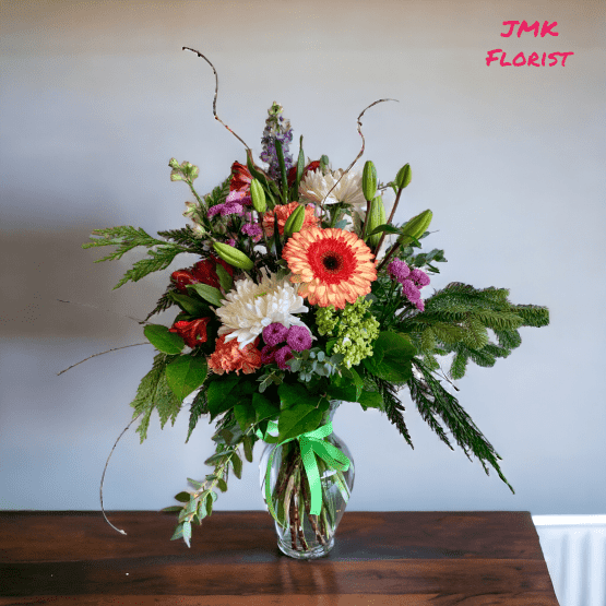 This arrangement is perfect for formal events or as a thoughtful gift, offering a dynamic mix of colors, textures, and fragrances. It’s sure to bring warmth, beauty, and elegance to any occasion.