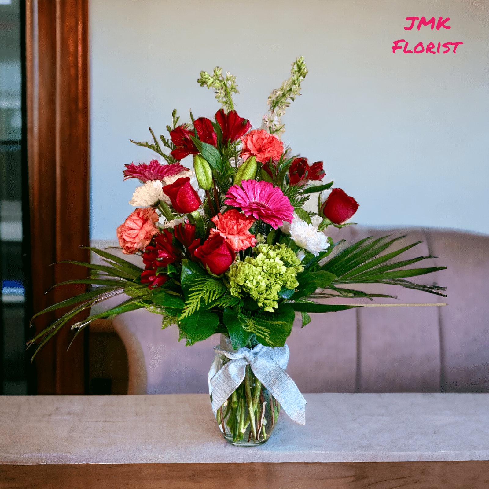 - Presentation: Arranged in a clear glass vase and tied with a light ribbon, this amazing flower arrangement offers a balanced visual appeal. Tall palm leaves provide height, while symmetrical layering of the flowers ensures a lush, full appearance. The red roses take center stage, surrounded by carnations and other florals for a dynamic and pleasing look.