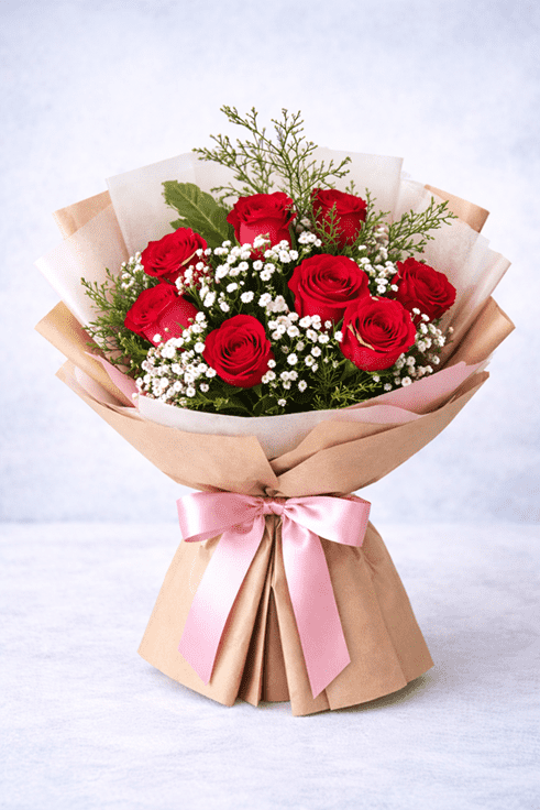- Flowers & Fillers: Featuring 8 fresh stems of red roses, this arrangement conveys messages of gratitude, recognition, and admiration. The vibrant roses are complemented by the soft, airy texture of the baby breath, creating a striking visual contrast. The red roses add a lively and cheerful energy, while the baby breath adds a hint of delicacy and elegance.