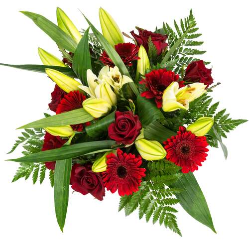 It looks like there’s a pot of gold at the end of this rainbow! Send a romantic gift like this one is always appreciated. Includes : Greens, White Oriental Lily, Red Rose and Gerbera.