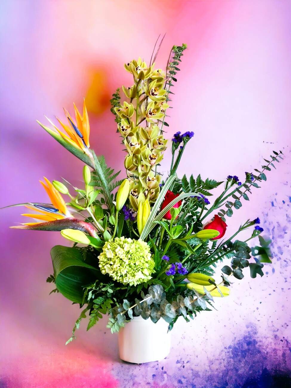 - Flowers & Greens: This striking arrangement features mini cymbidium orchids, known for their exotic beauty and elegance, paired with vibrant bird of paradise, symbolizing joy and paradise itself. Asiatic lilies add a touch of refined grace, while mini hydrangeas bring lush volume and texture. Classic red roses express love and passion, and sprigs of statice add a charming pop of color. The arrangement is complemented by fancy greenery, enhancing its rich, tropical aesthetic.