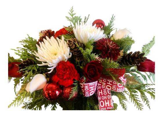 Included: white spider mum, red carnation, white rose, Christmas greenery and decorations in a table centerpiece.