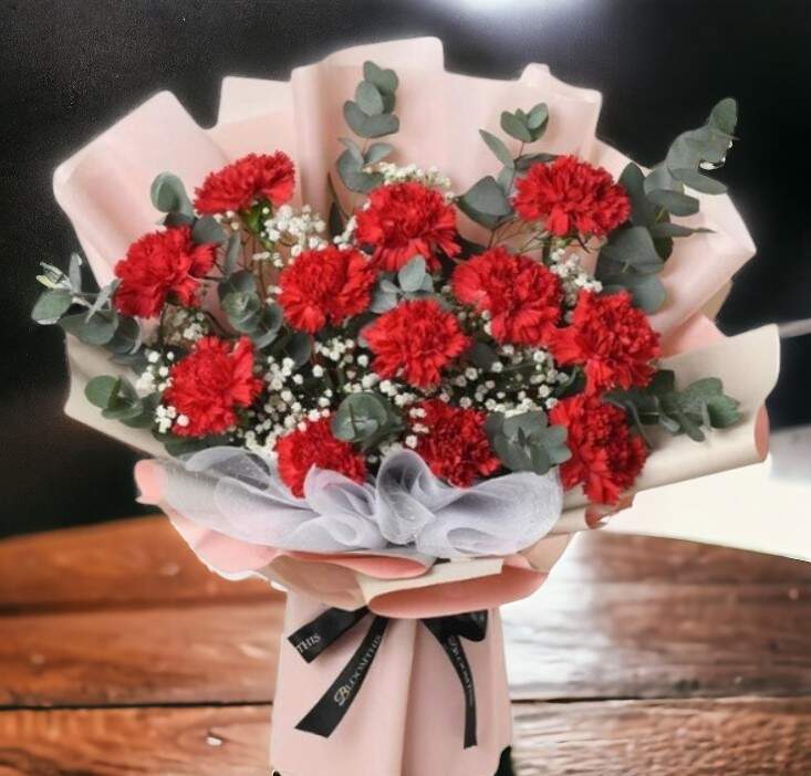 - Flowers & Symbolism: a dozen of red carnation, baby’s breath and eucalyptus greenery.