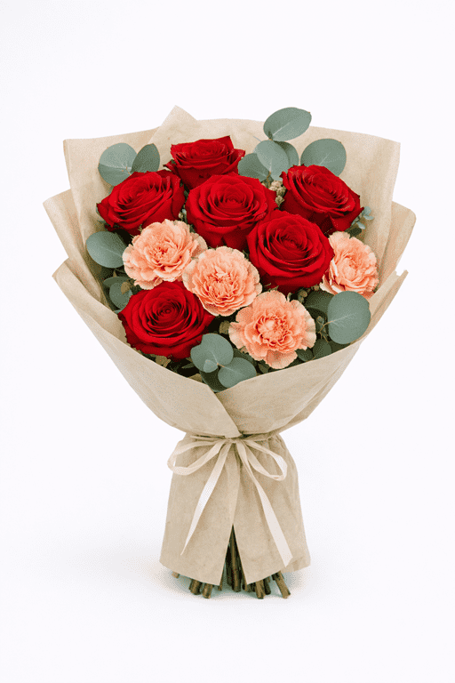 Included: 6 red roses, 4 carnations, and eucalyptus in fancy wrapping paper.