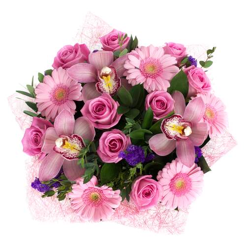 Deliver a timeless expression of hope, love, and happiness with a surprise that’s as sweet as can be. Includes : Greens, Rose, Gerbera, Pink Cymbidium Orchid and Purple Static.