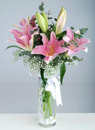 Send them a gift that is blooming with love for a romantic moment they’ll never forget! Includes : Clear Vase, Greens, 3 stems of Pink Lily and Baby Breathe.