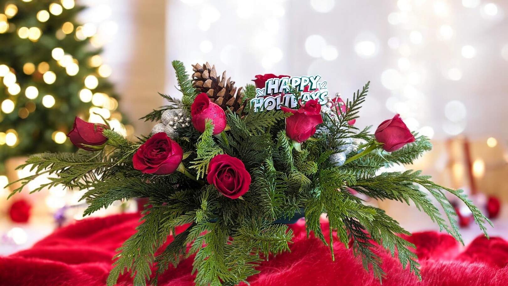 - Flowers & Greens: 12 stems of red rose and Christmas decorations in a centerpiece.
