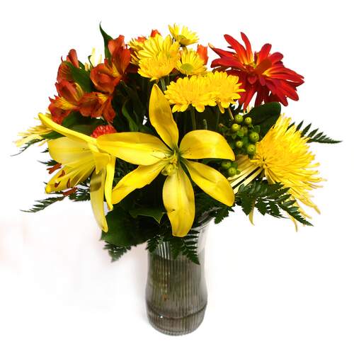 Share happiness and love with flowers in the Second Spring. Includes : Clear Vase, Greens, Gerbera, Daisy, Asistic Lily, Alstroemeria, Spider Mum and Green Hypericum Berry.
