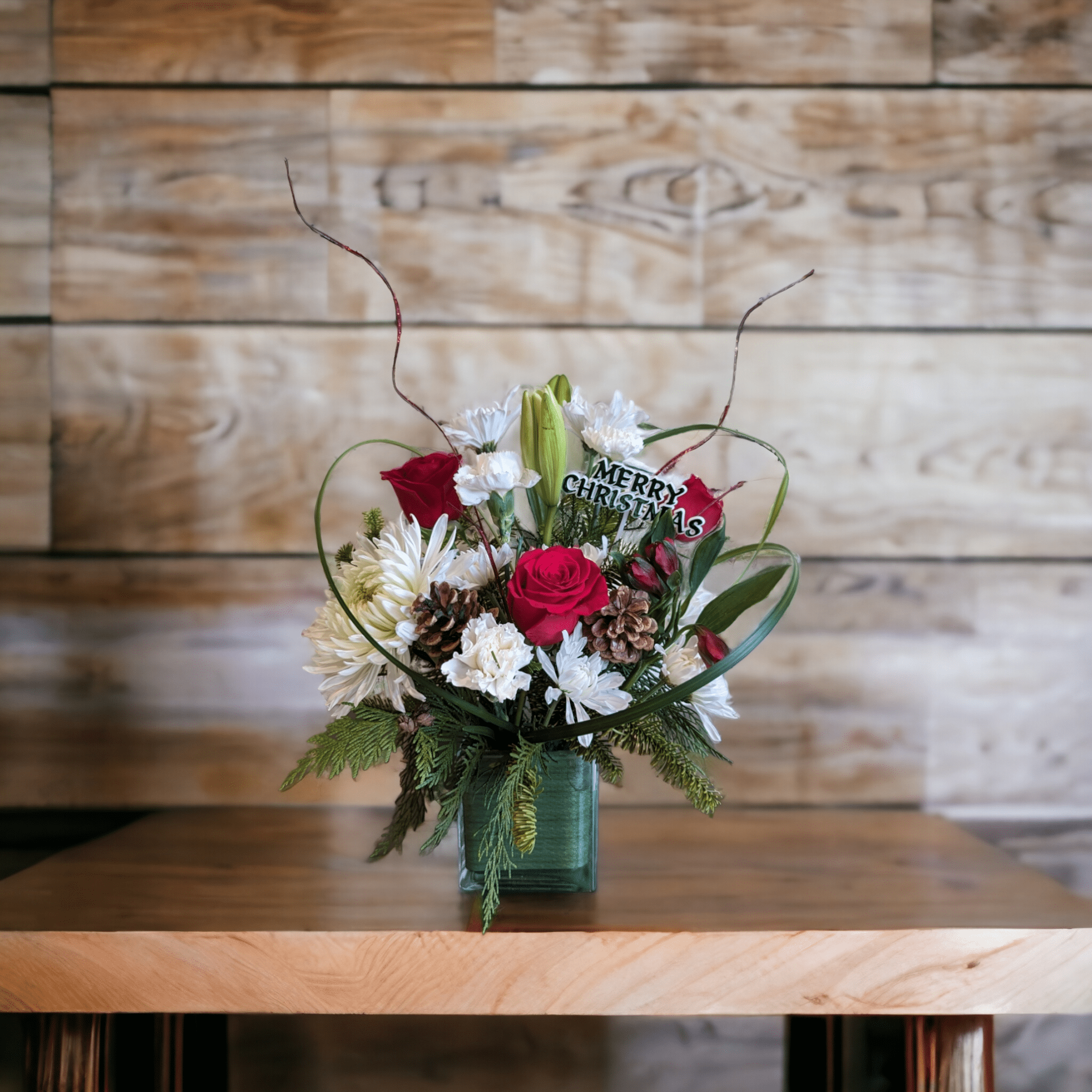 Included : Clear vase, white spider mum, red rose, white Asiatic lily, white carnation, white chrysanthemum daisy and red alstroemeria.