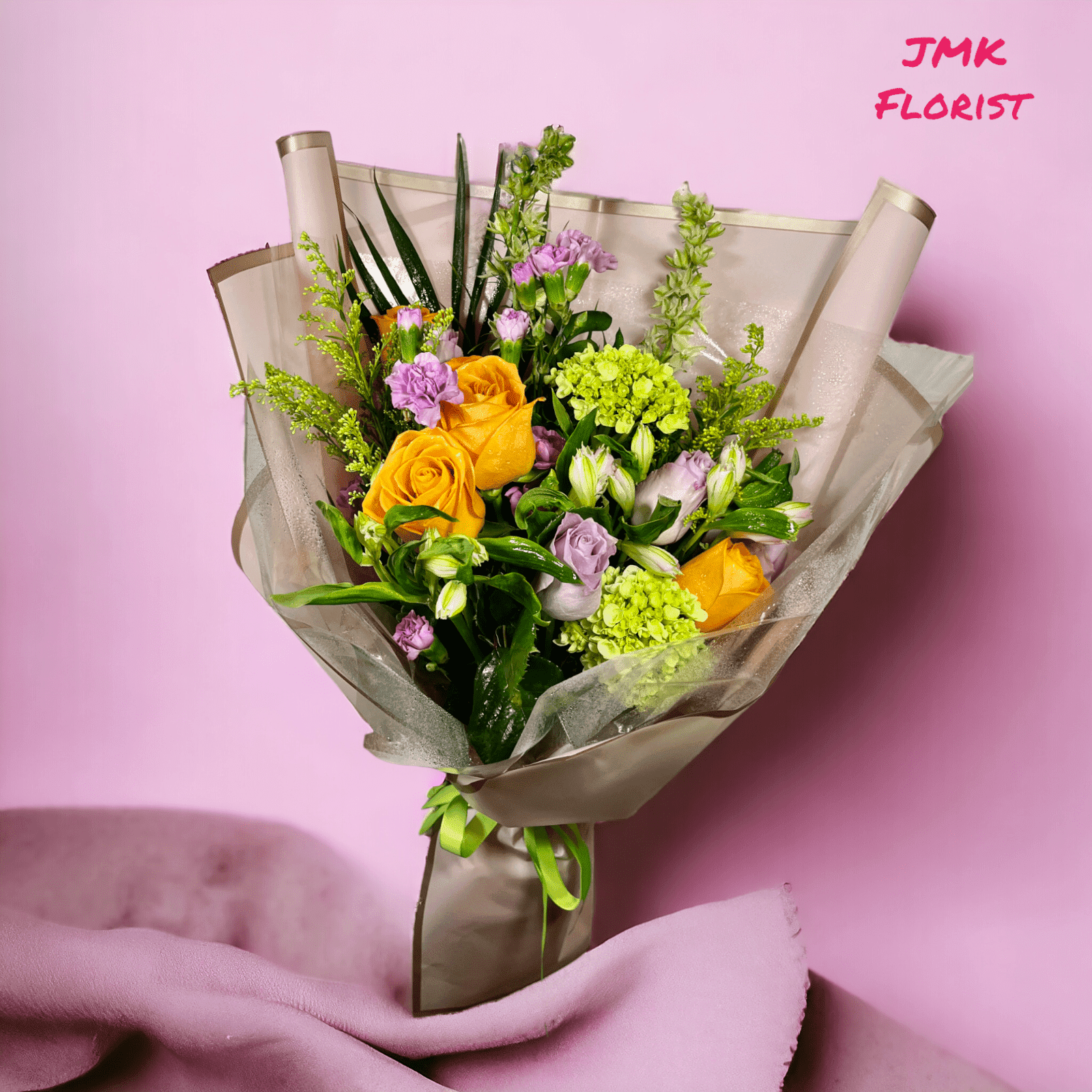 - This enchanting arrangement features 6 classic roses, 2 delicate mini hydrangeas, 3 vibrant alstroemeria stems, 2 graceful solidago stems, 7 cheerful carnations, and 2 elegant larkspur blooms, all artfully presented in a beautiful wrapping paper.